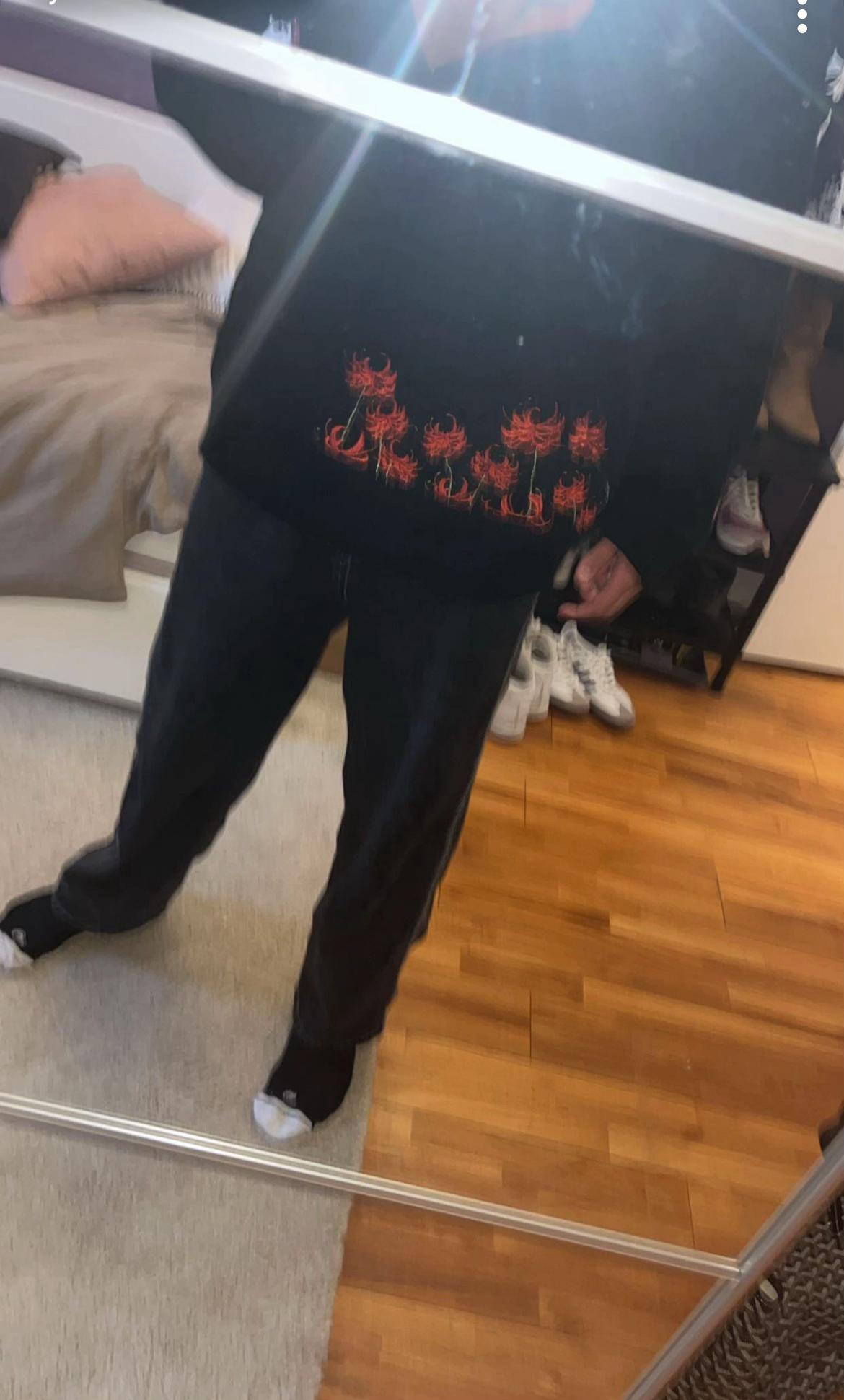 Le sweat Red Spider Lily rend super bien porté. J’aime beaucoup le motif rouge, ça change et ça passe avec tout.